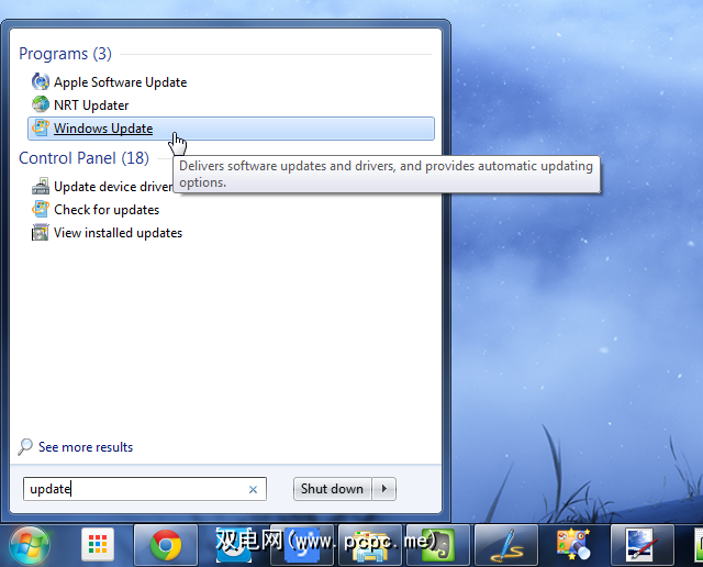 要打开Windows Update控制面板工具,请按计算机上的Windows键,键入“更新"(不带引号),然后单击出现的Windows Update快捷方式。在Windows 8上,必须先单击“设置"选项,然后才能看到Windows Update快捷方式。