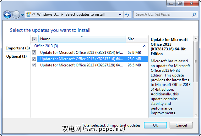如果手动进行更新,则可以单击Windows Update窗口中的“可用更新"文本,然后查看更新将被应用。如果愿意,请单击每个更新以查看更多信息。取消选中更新,它将不会安装。若要让Windows将来忽略更新,只需右键单击该特定更新,然后选择“隐藏更新"。