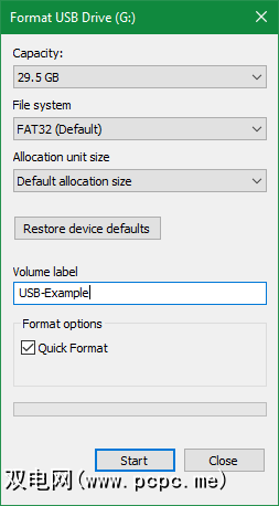 这将显示基本的Windows格式菜单。如果不确定要选择哪些选项,请阅读上述指南以获取提示,或点击恢复设备默认设置按钮以使用设备随附的设备。单击开始格式化驱动器。