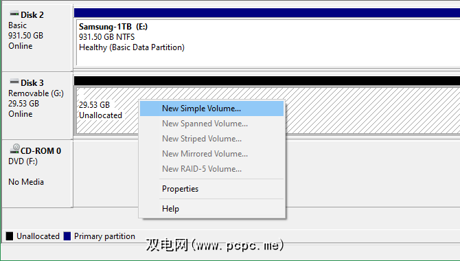 因此,您需要通过右键单击并选择 New Simple Volume 来创建一个新卷。 strong>,并逐步执行步骤(与其他格式化方法类似)。