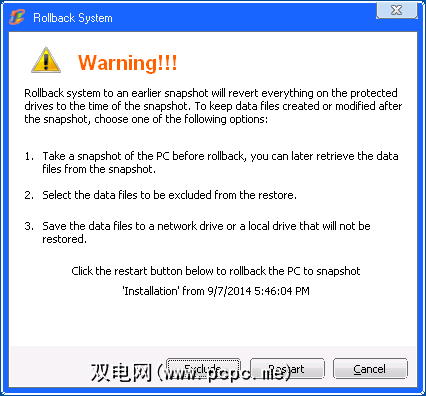 RollBack XP可以创建系统的完整副本,并在您需要时撤消更改。这就像创建Windows System Restore Point一样,效果更好。在系统运行的几秒钟内即可拍摄快照。还原是即时的,只需要重启一次即可。您甚至可以从无法启动的Windows XP还原。最棒的是,该工具对Windows XP用户是免费的。