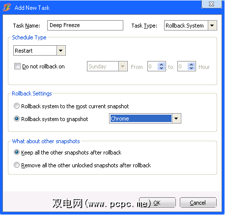您可以将工具的任务计划程序设置为以所需的时间间隔创建或还原快照。时间点。此功能之所以精巧,是因为按计划回滚到快照(例如,每次重新启动时)都会有效地冻结系统。换句话说,如果您破坏某物或获取恶意软件,只需重新启动即可解决该问题。
