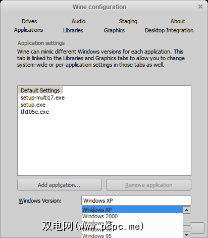 winecfg然后,单击Windows版本按钮。您会看到Wine可以模拟的不同Windows版本的列表。如果您使用的是 32位Wine ,则将显示比Windows XP更旧的版本,因为它们仅在32位模式下可用。