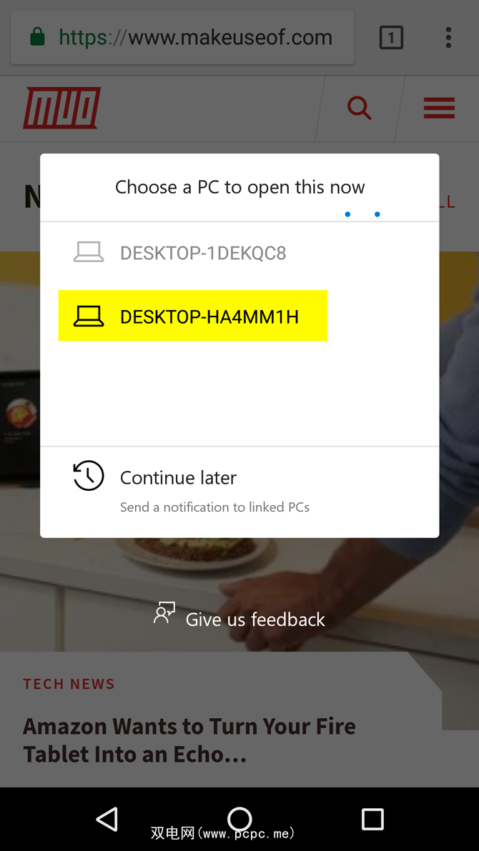 最后,选择要在浏览器标签中显示的PC。您也可以使用稍后继续"按钮,您可以根据自己的判断通过操作中心访问已保存的网站标签。现在,该网站将使用Windows 10的Edge浏览器显示在您选择的桌面上。