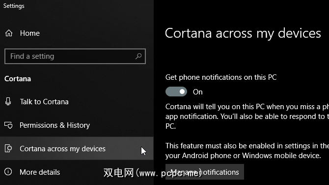 为确保允许在PC上进行通知传输,请打开开始菜单,然后输入Cortana。选择 Cortana和搜索设置选项。然后,在以下窗口左侧选择我的设备上的Cortana 标签,并启用在此PC上获取电话通知选项。