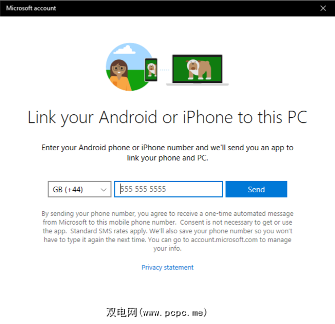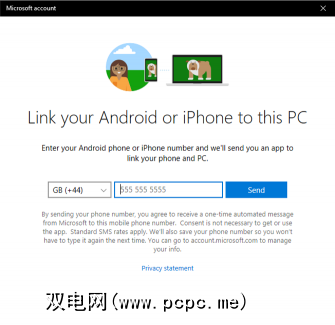 “电话"应用启动后,请按照说明进行操作,直到需要输入电话号码为止。这是向手机发送将其连接到PC的应用程序所必需的。输入您的电话号码并单击发送。