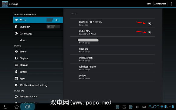 顶部的无线信号来自我的新路由器-Wireless-N路由器,而下方的是Wireless-G路由器,当我将平板电脑放在房屋的最远角落时,电视屏幕的亮度降低了一个杠铃。
