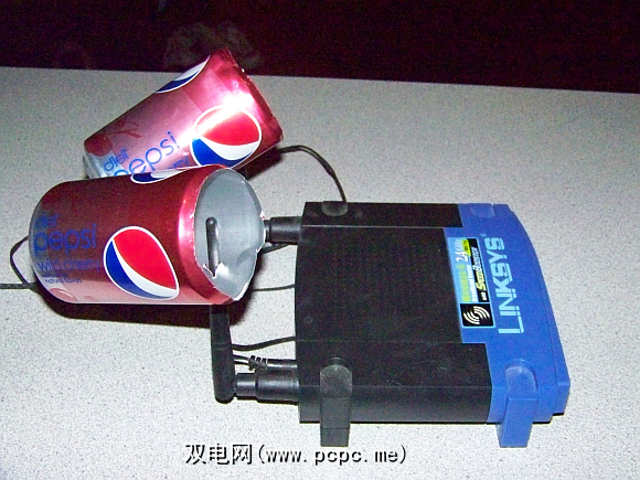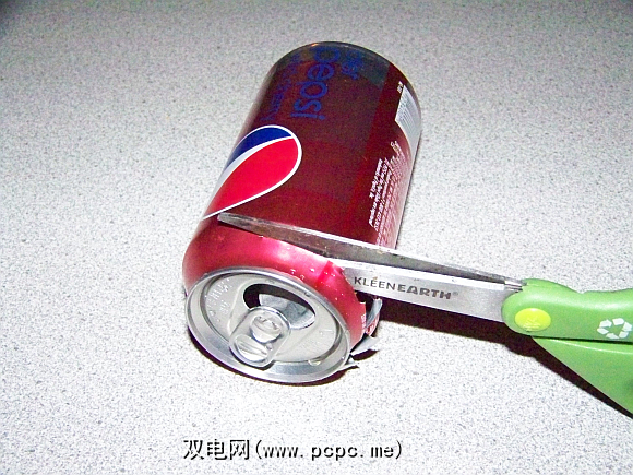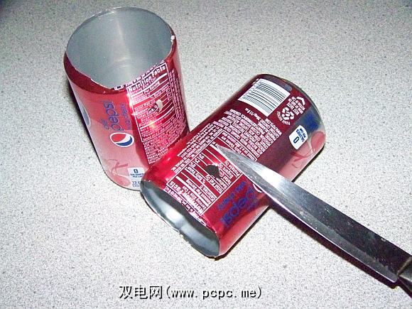 它既快速又简单。首先,剪掉两个苏打罐的末端(如果路由器上只有一根天线,则剪下一个)。注意罐子的尖锐边缘!