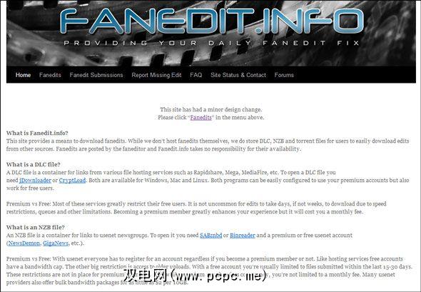 Fanedit.info是您可以从中找到的网站下载fanedits。实际上,这不是整个电影,而是DLC,NZB和torrent文件,用户可以轻松地从其他资源(如Rapidshare,BitTorrent和Usenet等)下载编辑。主页介绍了这些文件的性质以及如何下载它们。文件本身最终可能会或可能不会最终得到,因为文件托管站点(如Rapidshare和Mediafire)对版权侵权警告的重视程度越来越高,并会定期对文件中的任何内容进行删除。您可以通过Fanedit提交论坛在此处提交自己的粉丝编辑。