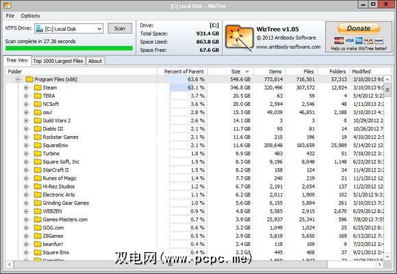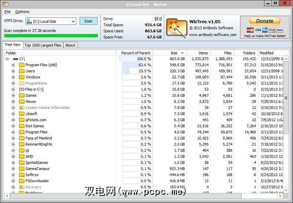 WizTree可以在32位和64位版本的Windows 2000,XP,Vista,7和8上运行。 ,它带有便携式版本。
