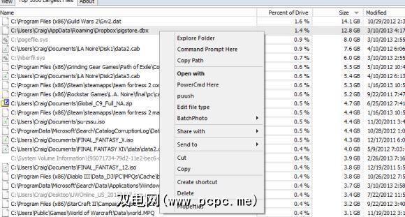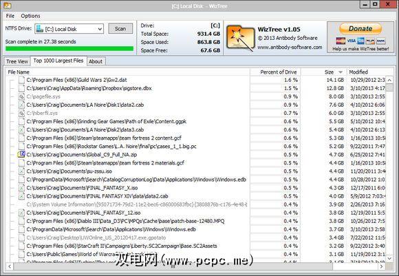 这非常有用。仅在此选项卡上,我就可以立即做出几个决定,这些决定可以为我节省超过20 GB的磁盘空间。为了解决磁盘空间不足的问题,只需清理我的Dropbox文件夹并清除Diablo III和其他一些游戏中的一些旧补丁文件,就可以缓解很大的空间,而且如果没有WizTree,这也不会让我烦恼。