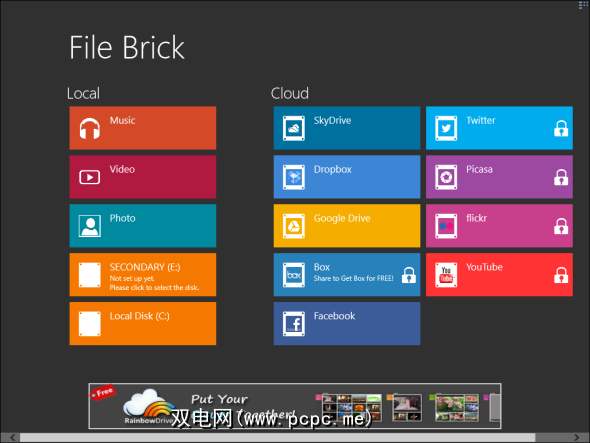 文件砖具有相当不错的界面除了其主屏幕上令人讨厌的大型广告横幅外,它在Windows 8上看起来像在家中。其突出的功能是对其他类型的云存储帐户的支持,尤其是它的Modern应用程序不会提供的一项服务