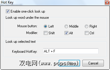 或者,您可以打开程序主窗口,然后进入 Options> Hotkey。我确实更改了默认的热键 Ctrl < / em> +右键单击以 Alt +(常规)左键单击,因为我认为这样会更加无缝。我还更改了热键以打开字典,同时将单词突出显示为 Alt + F ,因为默认情况下我的手指通常位于这些键上方。