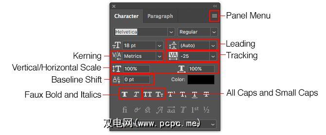 在中单击字符和段落面板按钮>选项栏。第一个选项卡包含一组用于格式化字符的选项。某些选项使我们已经看到的选项加倍(例如选择字体和颜色),而其余选项则使您可以精挑细选。