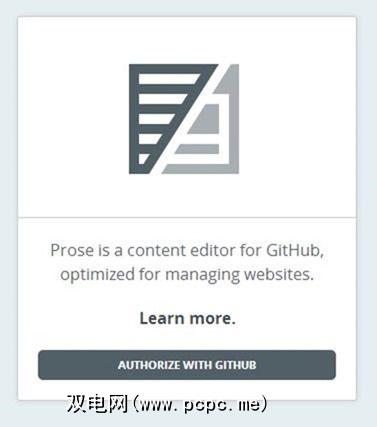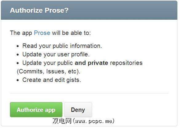 要使用Prose,必须首先拥有GitHub帐户。假设您已登录Git,只需单击Prose的Authorize按钮: