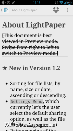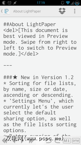 LightPaper仍然无法在耳朵后面浸湿一些东西。首先是自动保存和版本控制:该编辑器包含撤消/重做功能,但是如果它能定期自动保存文本并让您浏览较旧的版本并根据需要进行还原,那将很好。然后就是上述的双向Dropbox同步-可以保存到Dropbox很好,但是加载将使其真正有用。