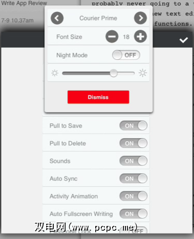 写入非常直观使用,点击应用程序设置即可进行多种自定义。这些功能包括调整屏幕亮度,启用 Night Mode 以及更改字体样式和大小的功能。有一些选项可用于启用密码锁定,禁用声音,与云自动同步以及切换动画。该应用程序还支持iOS TextExpander [不再可用]。
