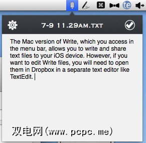 通过菜单栏访问Mac版本的Write。它仅允许您编写文本文件并将其共享到iOS设备。如果要在Mac上编辑iOS Write文件,则需要从Dropbox中存储的Write文件夹中打开它们,然后在单独的文本编辑器(如TextEdit)中对其进行编辑。