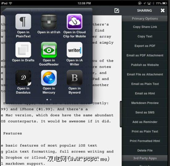 与其他iOS文本编辑器不同的是,“书写"设置是共享文本的几种不同方式其他第三方应用程序,例如Evernote,Byword,Dropbox和Catch。您还可以将笔记发布到Facebook,Twitter,Google Drive,Tweetbot和CloudApp。