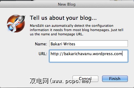 You can start using MarsEdit with your existing blog or by creating a new one. In most cases it will configure the information it needs for your existing blogging platform and will download your most recently published posts. You will need to input the name of your blog, the homepage URL, and the sign-in information.