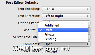 撰写和编辑草稿后(或之前,如果愿意),您可以单击工具栏中的选项按钮并为您的帖子分配一个或多个类别,然后选择自动发布,或将其发布为草稿,待审核或私有条目。您还可以在导出前检查是否接受引用。