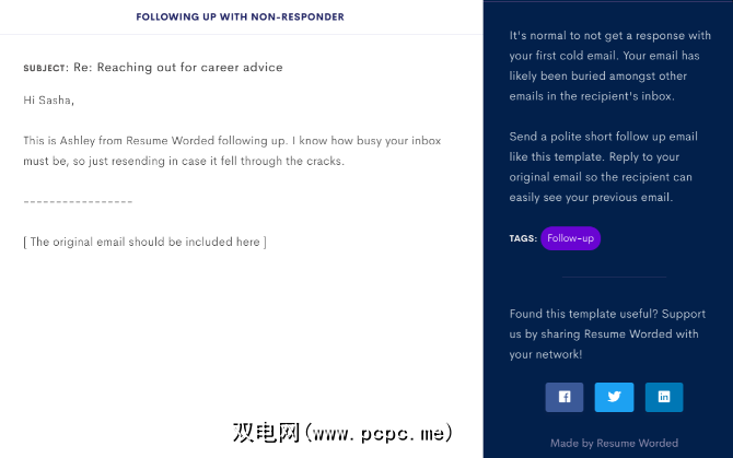 您遇到一个可以帮助您完成工作,交换电子邮件的人,然后您必须跟进他们。但是如何?我们大多数人都在努力寻找合适的词,以寻求帮助,工作或与他们进一步推动与工作相关的事业。 Resume Worded是最好的简历和简历网站之一,在这种情况下,汇集了50多种电子邮件模板。