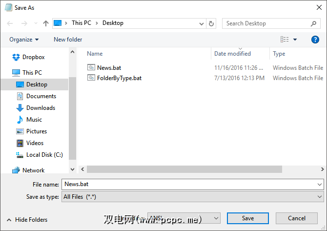 @echo offstart "" http://www.cnn.comstart "" http://www.abc.comstart "" http://www.msnbc.comstart "" http://www.bbc.comstart "" http://www.huffingtonpost.comstart "" http://www.aljazeera.comstart "" https://news.google.com/上面的脚本将一个开始“" 参数堆叠在另一个之上,以打开多个选项卡。您可以用自己选择的链接替换提供的链接。输入脚本后,转到文件,然后依次另存为。在“另存为"窗口中,使用扩展名 .bat 保存文件,并将另存为类型参数更改为所有文件(*。*) 。