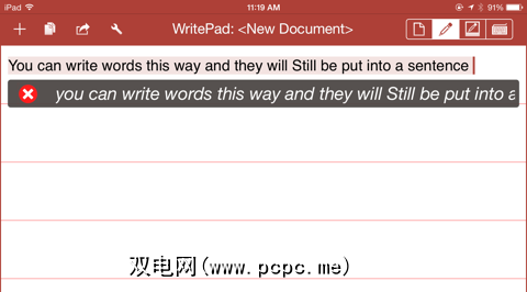 WritePad允许您在文档页面上的任何地方进行手写,并且在抬起手指或手写笔时,它将手写内容转换为数字文本。您仍然需要水平书写单词,但是不必将它们写在同一行上,并且在转换发生之前不必写完整的句子。