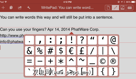 另一种快速手指手势会弹出一个特殊的标点键盘,对于WritePad无法识别的手写标点很有用。