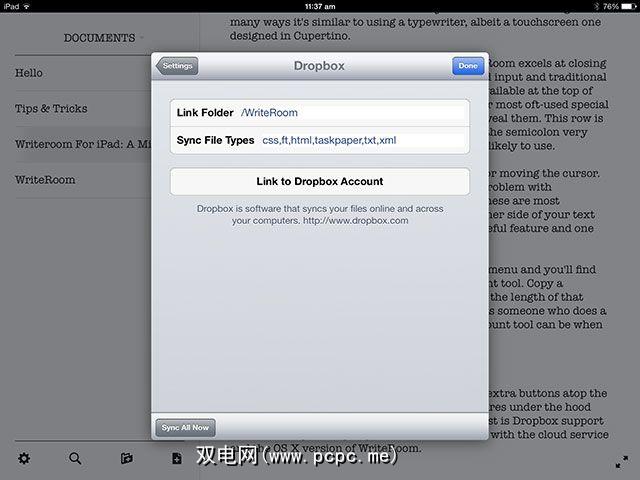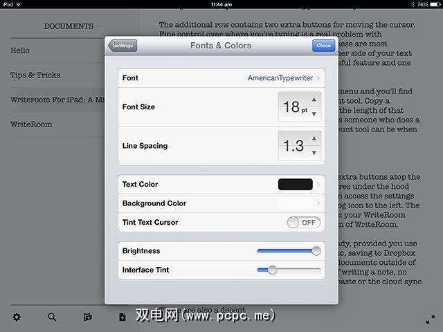 上面提到的键盘顶部可自定义的额外按钮,WriteRoom在引擎盖下还有很多其他功能,可以根据您的喜好进行调整。您可以通过点击左侧的齿轮图标从文档列表视图访问这些设置。 WriteRoom带有Dropbox支持,可用于将WriteRoom iOS应用与云服务和OS X版本的WriteRoom同步。