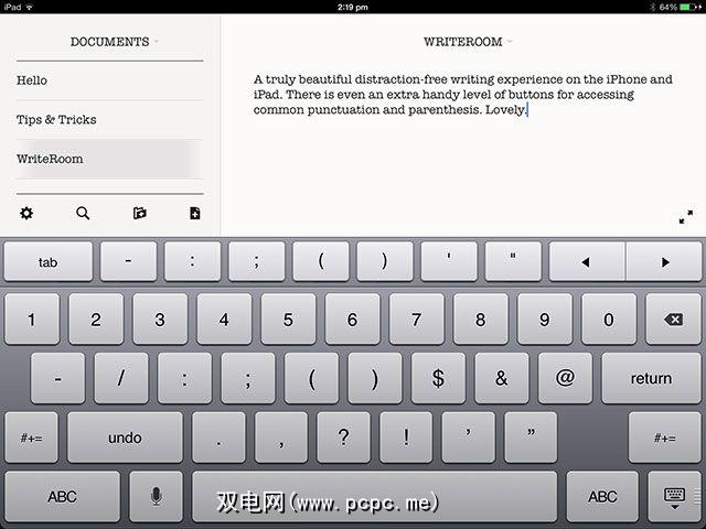 在旧技术的类比结尾处,WriteRoom擅长缩小了触摸屏软件增强型输入与传统机械按钮之间的距离。键盘顶部的额外一排按钮使您更容易访问最常用的特殊字符,而无需按。?123 键来显示它们。该行也可以完全自定义,因此,如果您不经常使用分号,则可以将其换成其他内容。