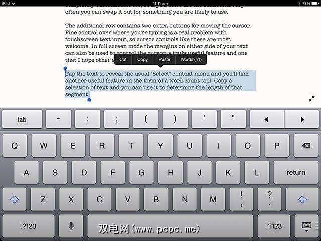 点击屏幕上的文字可以显示通常的“选择"上下文菜单,您还会以字数统计工具的形式找到另一个有用的功能。复制选定的文本,您可以使用它来确定该段的长度。它不会改变世界,但正如许多人可以证明的那样,一个字数统计工具在您需要时非常方便。