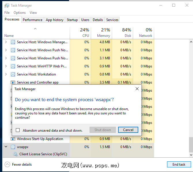 Windows认为WSAPPX是至关重要的系统进程。因此,如果您尝试通过任务管理器结束它,则会警告您结束该过程可能导致Windows变得不稳定。