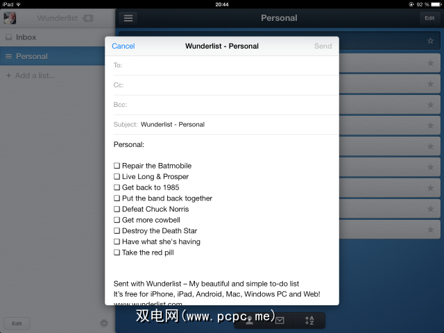 您是否要发送您的待办事项列出没有Wunderlist且不想安装的人?好吧,那么您就无法击败老式的电子邮件。只需点击屏幕底部的信封图标,Apple Mail就会打开一个新的电子邮件窗口,其中已经插入了待办事项列表。您所需要做的就是输入地址,然后消失。