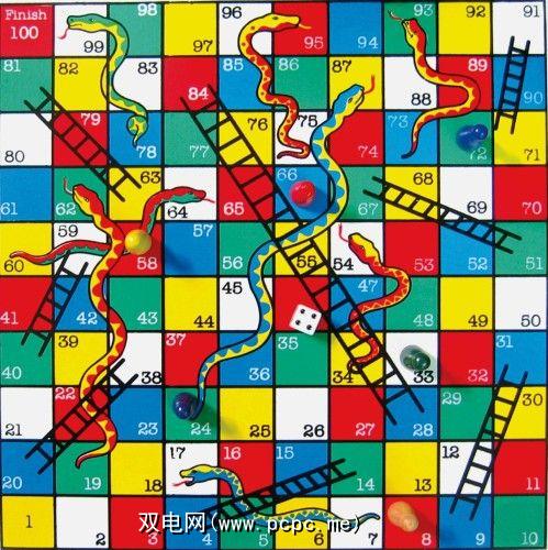 游戏也起源于印度。全世界都知道它是蛇和梯子,但是在美国,密尔顿·布拉德利(Milton Bradley)发现美国小学生对它们的反应很差之后,在1943年,蛇被滑槽所取代。