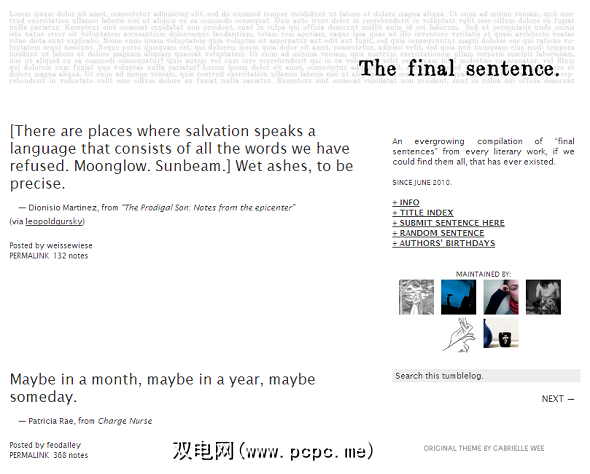 《最后一句话》将近3年,是一个令人着迷的Tumblr博客,该博客提供了令人印象深刻的最后一句话,即他们可以找到并记录的许多文学作品的最后一句话。虽然“最终判决"由一群撰稿人提供,但您也可以提出自己的建议-但在执行此操作之前,请务必先阅读指南。