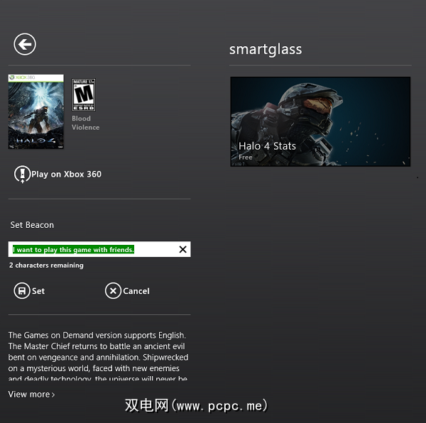 如果您从Windows 8应用程序的仪表板上选择Halo 4,带到下面的屏幕。从那里,您可以设置信标-通知,通知您的朋友您要玩什么游戏。您也可以单击Xbox 360上的“播放"按钮来玩游戏,但是显然您需要安装磁盘或硬盘上下载的游戏才能正常工作。