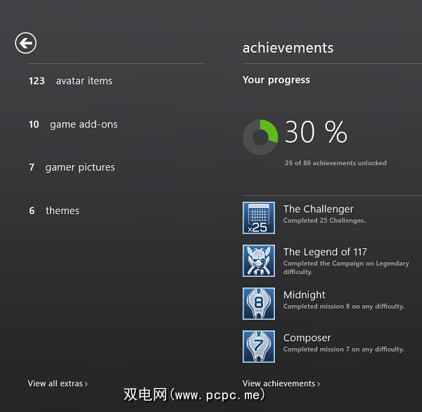 向右滚动可允许您会看到与游戏有关的其他项目,例如附加组件或主题,以及您在游戏中的成就和进步。