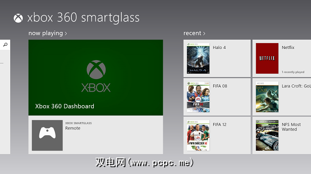 SmartGlass应用程序的设计与Windows 8应用程序的设计相同:很多正方形和侧滚动。它将向您显示您最近玩过的游戏,您当前正在玩的游戏,以及如果您向左滚动则具有搜索选项。