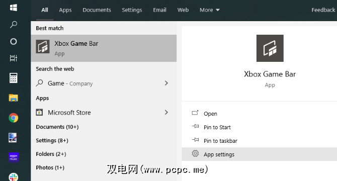 修复Xbox Game Bar很容易。按开始,然后输入游戏栏以显示该应用,然后选择应用设置。