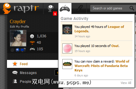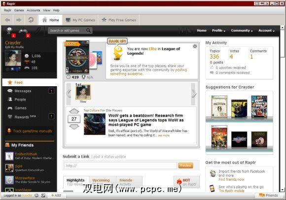 与Xfire相比,Raptr更贴近社交网络。您会收到提醒您游戏时间记录和成就的消息和通知,就像在Facebook上收到警报一样。