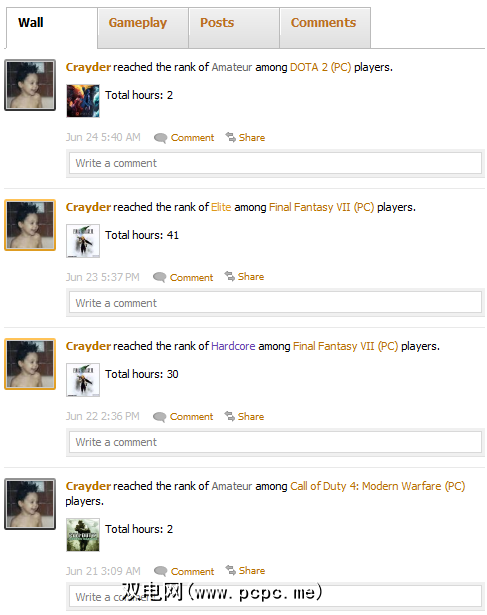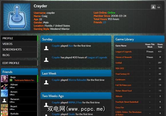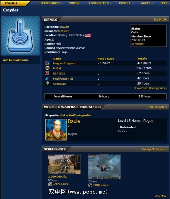 配置文件提供了一个广泛的信息,包括您的游戏时间,WoW等大型游戏中的游戏角色,屏幕截图,好友等。如果您选择Xfire的新网站布局,则会显示用户个人资料:
