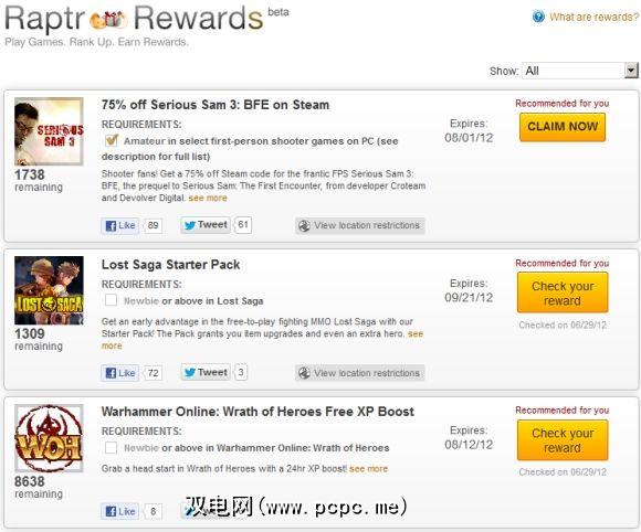 Raptr客户端的一个非常独特而有趣的功能是,您能够真正解锁奖励和赠品,而只是使用该软件来跟踪您的游戏时间。奖励包括访问封闭测试版以及免费的DLC和游戏内物品。