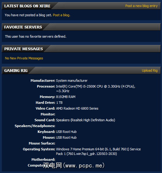 Xfire中有很多丢失和未充分使用的功能,例如整个私人消息传递系统,博客,收藏夹服务器等。 。一种独特且值得赞赏的非常酷的功能是自动上传游戏装备的方式,以便所有朋友都能看到您正在运行的规格。