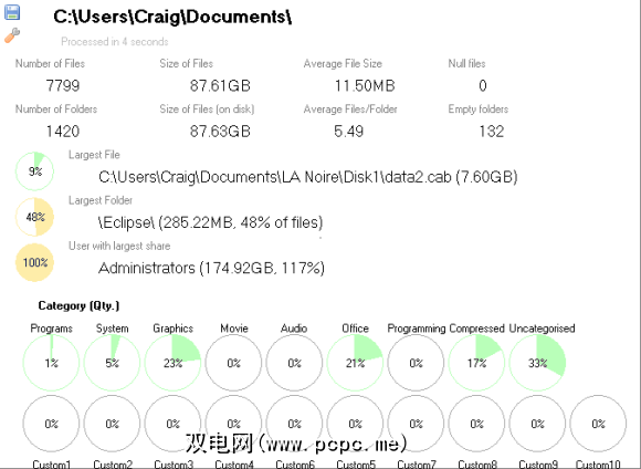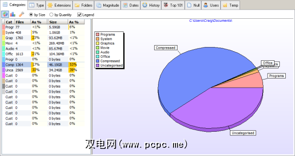 扫描摘要页面显示了很多有趣的信息。您可以看到,扫描仅用了4秒钟即可处理近8,000个文件。请记住,扫描时间完全取决于您的处理器。然后,您可以查看扫描的大文件,最大的文件夹和最大的用户文件夹。然后,根据饼图中的类别将文件细分。单击左上角的扳手图标,可以将扫描结果从数量切换到尺寸。