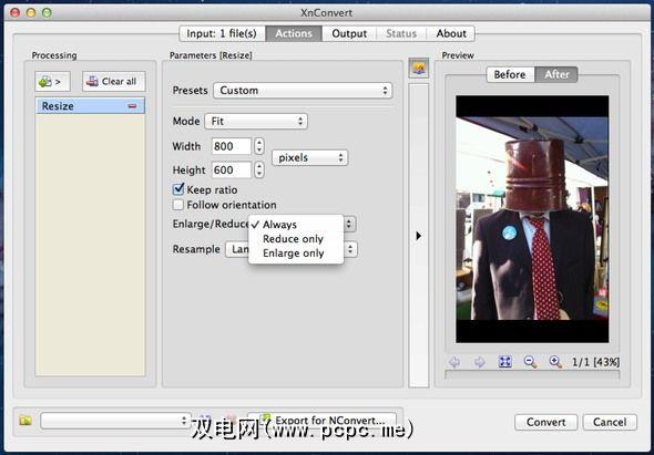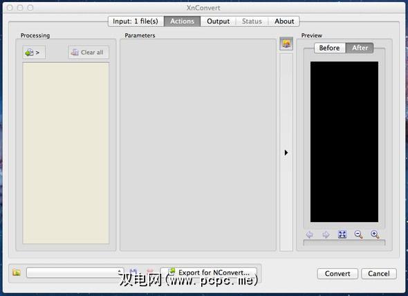 动作 tab分为三个区域:“处理",“参数"和“预览"。从“参数"面板中选择一个操作,以查看可用的参数。根据操作的不同,可能会有很多不同的设置可供选择,因为XnConvert不会保留细节,这很好,但是可以有时会吸引您。我了解到,当将一批混合大小的图像缩小到设置的大小时,需要确保在放大/缩小中为 Resize < / em>操作,否则它将放大您的小图像并缩小您的大图像。