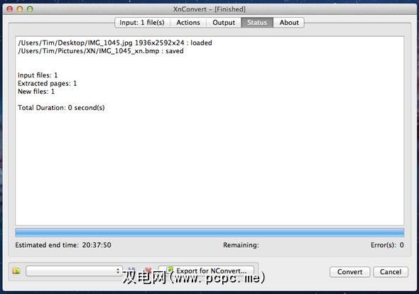 预览区域可让您循环浏览输入的图像看看最终结果会是什么样子。从那里到 Output 标签,这是转换图像之前的最后阶段。就像输入选项一样,有大量的输出文件类型可供选择,其中许多带有额外的压缩,隔行等参数,但是不幸的是没有最大文件大小选项。剩下要做的就是单击转换,这时会弹出状态窗口并发生魔术。