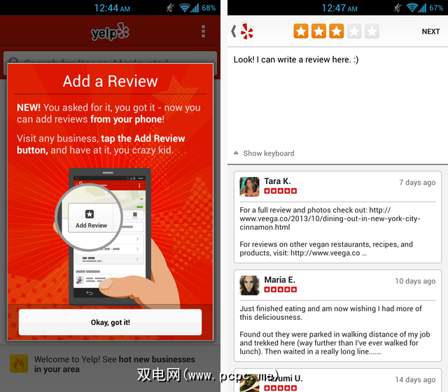 Yelp在去年8月将相同功能添加到iOS之后,终于更新了其Android应用,以允许用户从其设备发布评论。以前,用户只能在他们的移动设备上发布提示或评论草稿,而不得不等到他们回到计算机上才能真正发布评论。提示目前仍然存在,但只是用于注释更短而不是进行深入的评论。
