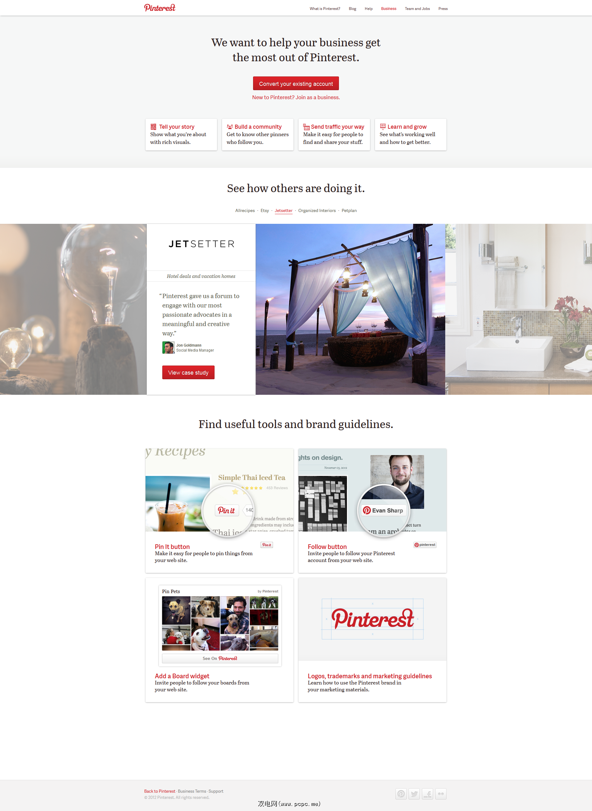 Pinterest不仅适合人们。企业可以从在Pinterest上推广产品中受益。您可以作为企业加入Pinterest或通过business.pinterest.com将现有的个人帐户转换为Pinterest企业帐户。许多企业正在使用Pinterest来增加销售和对其品牌和产品的兴趣。您可以阅读一些案例研究,确切地显示了一些企业如何利用Pinterest的热潮。然后使用您学到的知识发展自己的业务!
