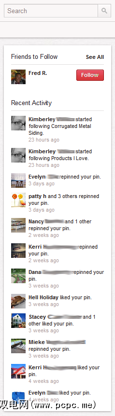 您的Pinterest主页显示一个列表页面左侧的“近期活动"。在这里您可以看到类似这样的通知:
